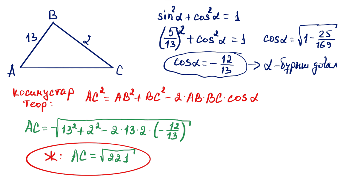 № 10 $ABC$ үшбұрышының $AC$ қабырғасының ұзындығын табыңыз, мұндағы $B$ бұрышы доғал, $AB=13$; $BC=2$ және $\sin\angle B=\dfrac{5}{13}$