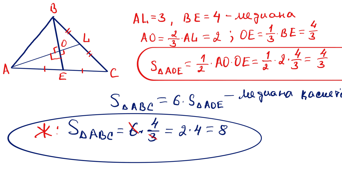 № 12 Үшбұрыштағы ұзындықтары 3 және 4 болатын екі медиана тік бұрыш жасап қиылысады. Үшбұрыштың ауданын табыңыз.