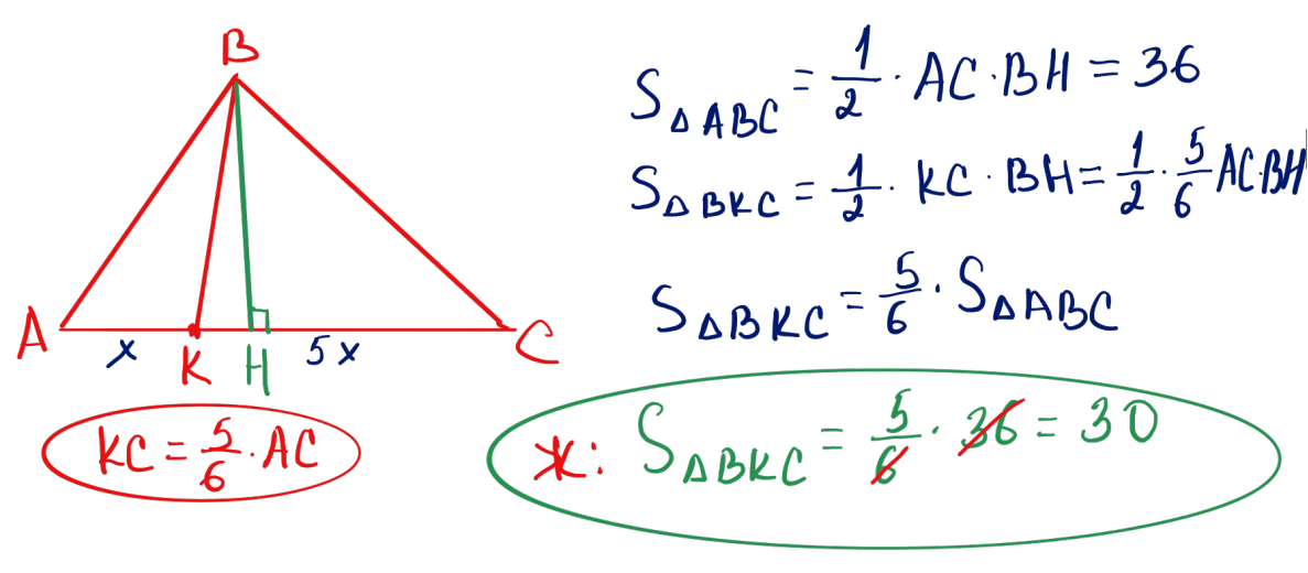 № 13 $ABC$ үшбұрышының ауданы 36-ға тең. $AK:KC=1:5$ болатындай, $AC$ қабырғасында $K$ нүктесі алынған. $KBC$ үшбұрышының ауданын табыңыз.