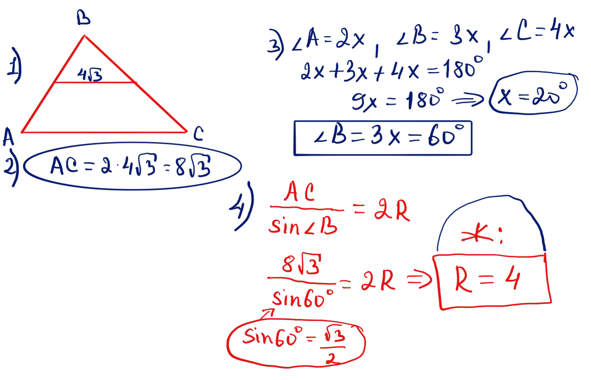 № 14 Орта сызығы $4\sqrt{3}$, бұрыштарының шамалары 2; 3 және 4 сандарына пропорционал болатын үшбұрышқа сырттай сызылған шеңбердің радиусын есептеңіз.