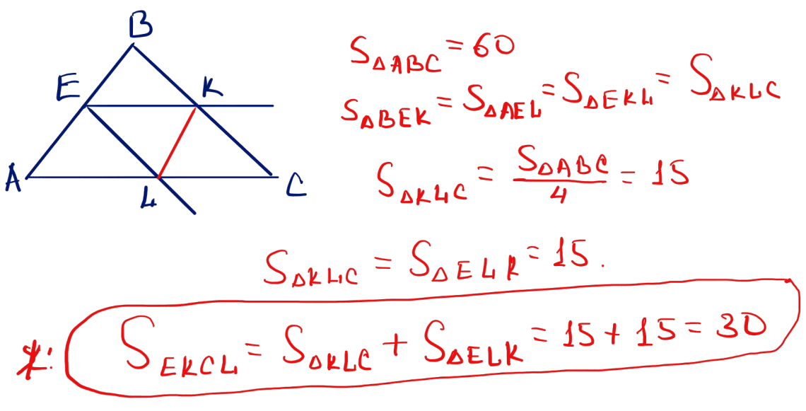 № 15 Үшбұрыш қабырғасының ортасынан түзуелер жүргізілген, олар оның басқа екі қабырғаларына параллель. Егер осы үшбұрыштың ауданы 60 болса, шыққан төртбұрыштың ауданын табыңыз.