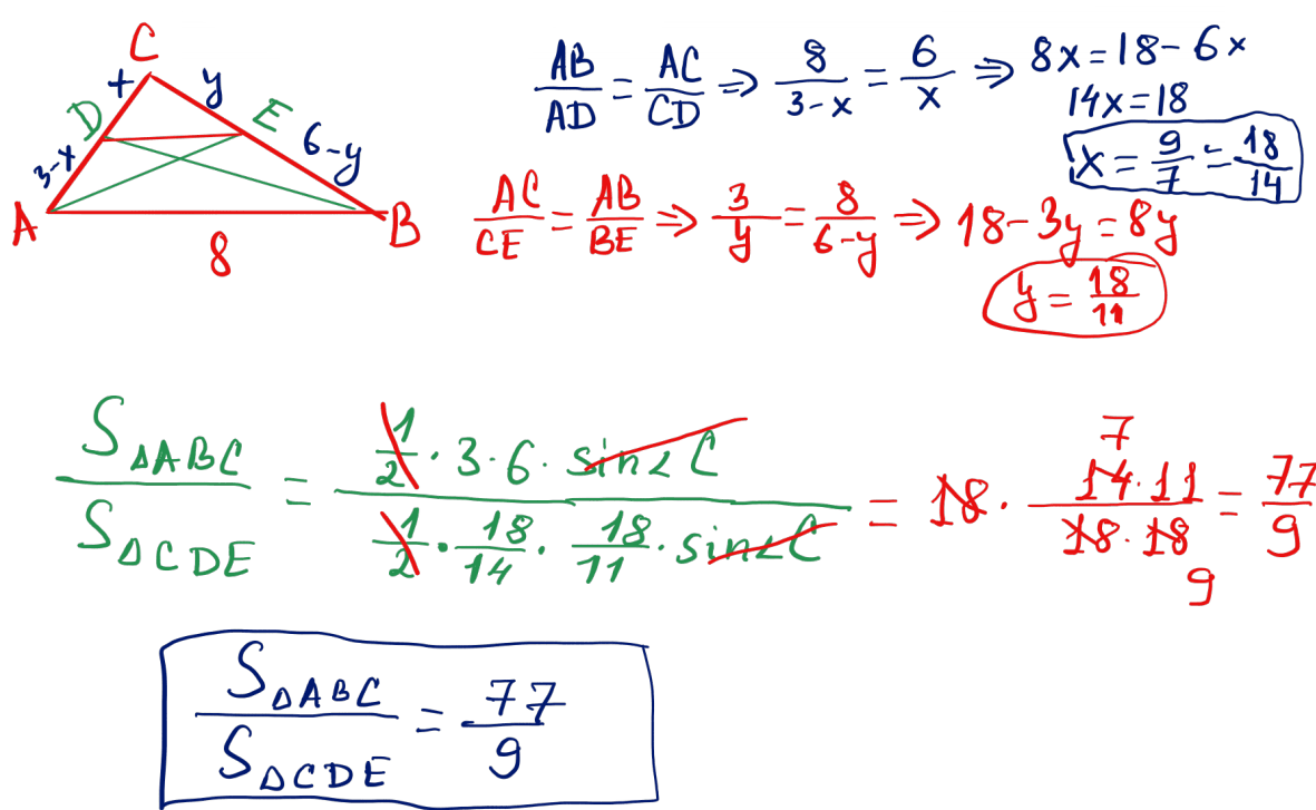 № 16 $ABC$ үшбұрышында: $AB=8$; $BC=6$; $CA=3$ сәйкесінше бұрыштардың биссектрисалары $BD$ және $AE$. $ABC$ және $CDE$ үшбұрыштарының аудандарының қатынасын табыңыз.
