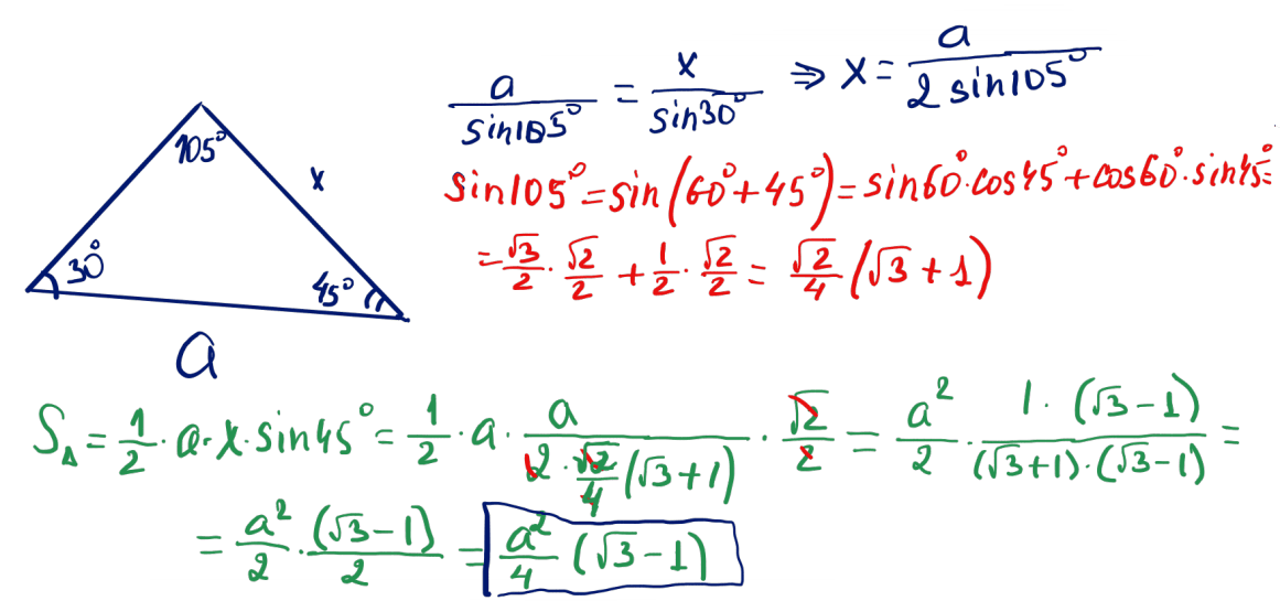 № 17 Үшбұрыштың табаны $a$-ға тең, ал табанының бұрыштары $\dfrac{\pi}{6}$ және $\dfrac{\pi}{4}$ тең болса, үшбұрыштың ауданын табыңыз.