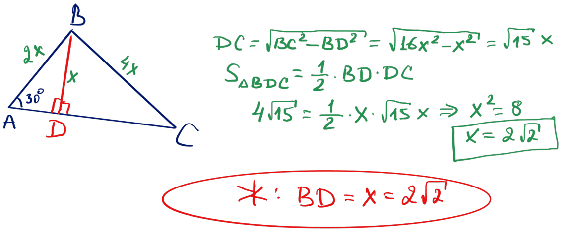 № 18 $ABC$ үшбұрышындағы $A$ бұрышы $30^\circ$-қа тең, ал $BC$ қабырғасы $AB$ қабырғасынан екі есе артық. Егер $BDC$ үшбұрышының ауданы $4\sqrt{15}$ тең болса, $AC$ қабырғасына $B$ төбесінен жүргізілген $BD$ биіктігін табыңыз.