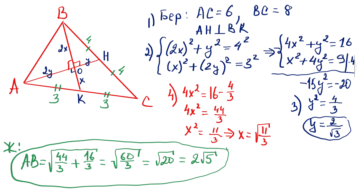 № 19 Үшбұрыштың екі қабырғасы сәйкесінше 6 және 8. Осы қабырғаларға жүргізілген медианалар өзара перпендикуляр. Үшбұрыштың үшінші қабырғасын табыңыз.
