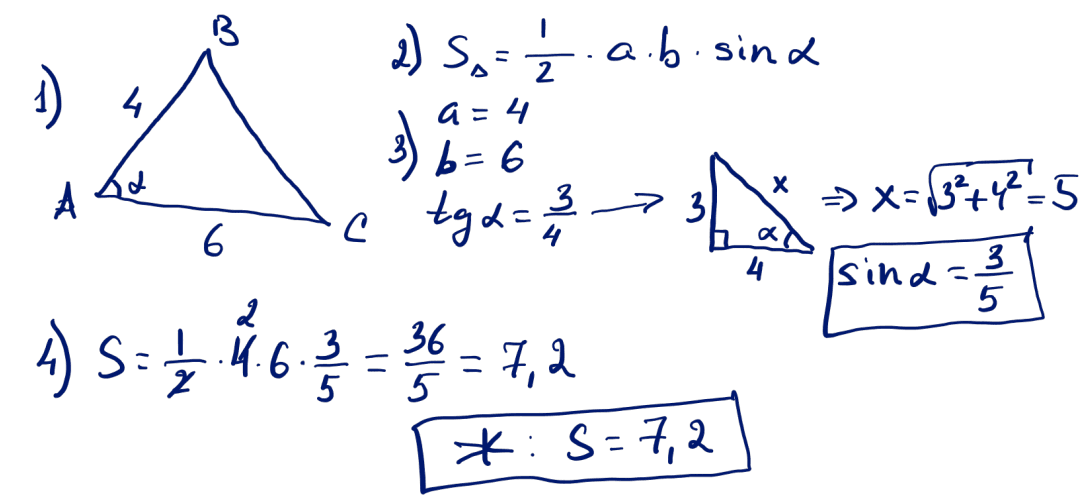 № 1 Қабырғаларының ұзындықтары 4 және 6, ал олардың арасындағы бұрышының тангенсі 0,75-ке тең екендігі белгілі болса, үшбұрыштың ауданын табыңыз.