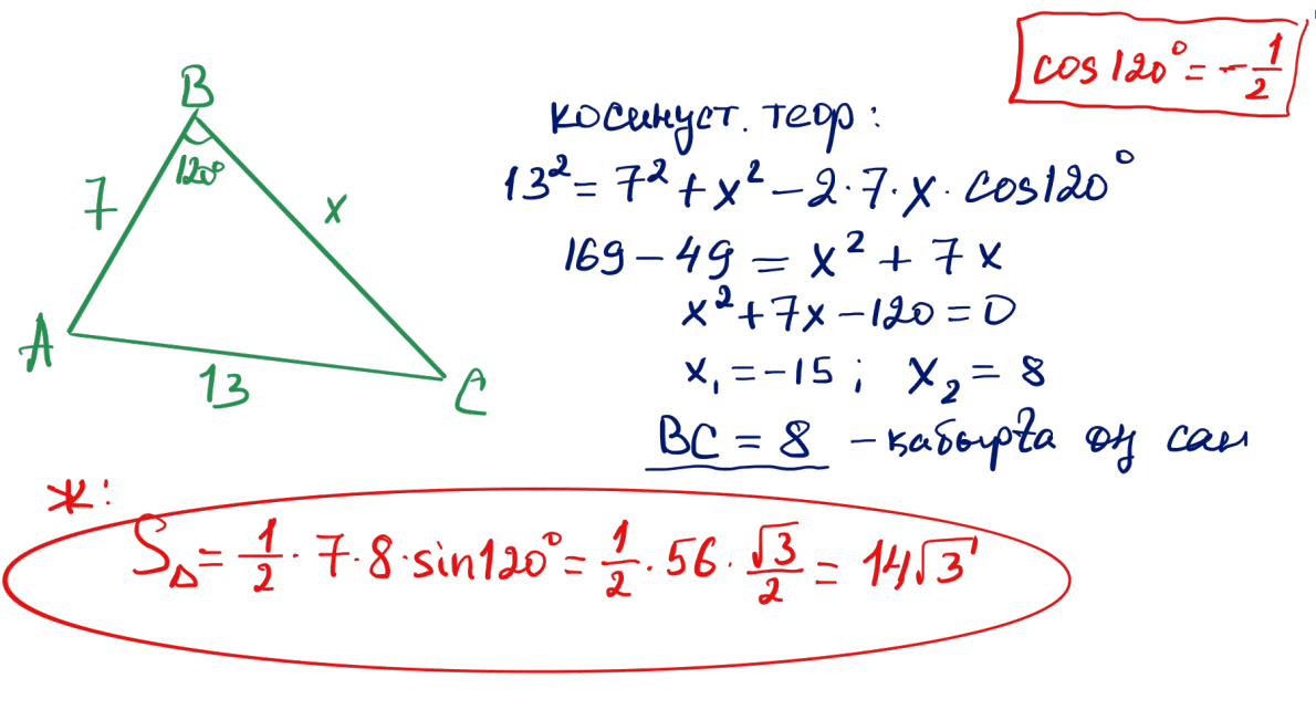 № 20 $ABC$ үшбұрышында $\angle B=120^\circ$; $AB=7$; $AC=13$. Үшбұрыштың ауданын табыңыз.
