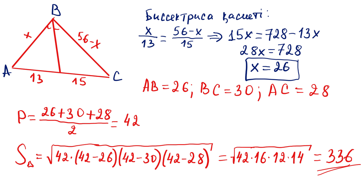 № 21 Үшбұрыштың ішкі бұрышының биссектрисасы қабырғаны 13 және 15-ке тең кесінділерге бөледі. Екі қалған қабырғаларының қосындысы 56 болса, үшбұрыштың ауданын табыңыз.