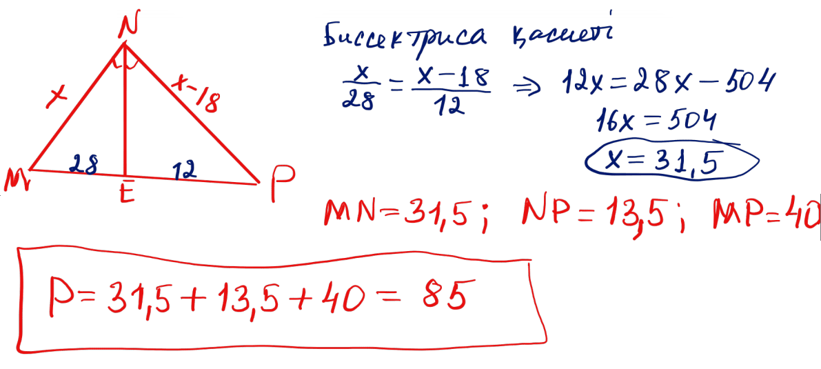 № 22 $MNP$ үшбұрышының $N$ бұрышының биссектрисасы $MP$ қабырғасын 28 және 12-ге тең кесінділерге бөледі. Егер $MN-NP=18$ болса, $MNP$ үшбұрышының периметрін табыңыз.