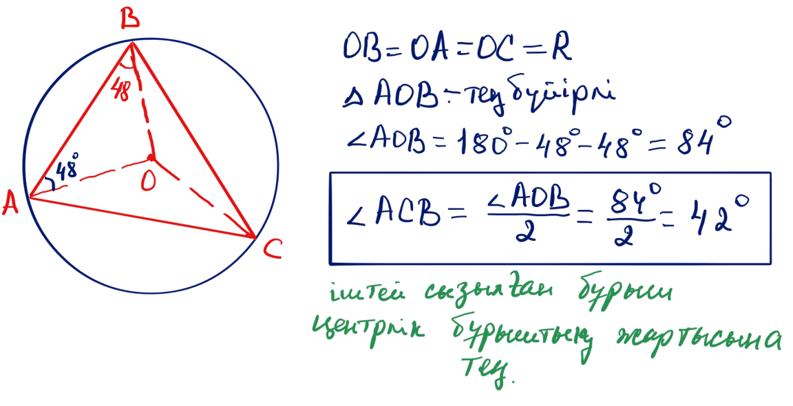 № 24 $O$ нүктесі, $ABC$ үшбұрышының төбесінен бірдей қашықтықта, $\angle ABO=48^\circ$. $\angle ACB$ бұрышын табыңыз.
