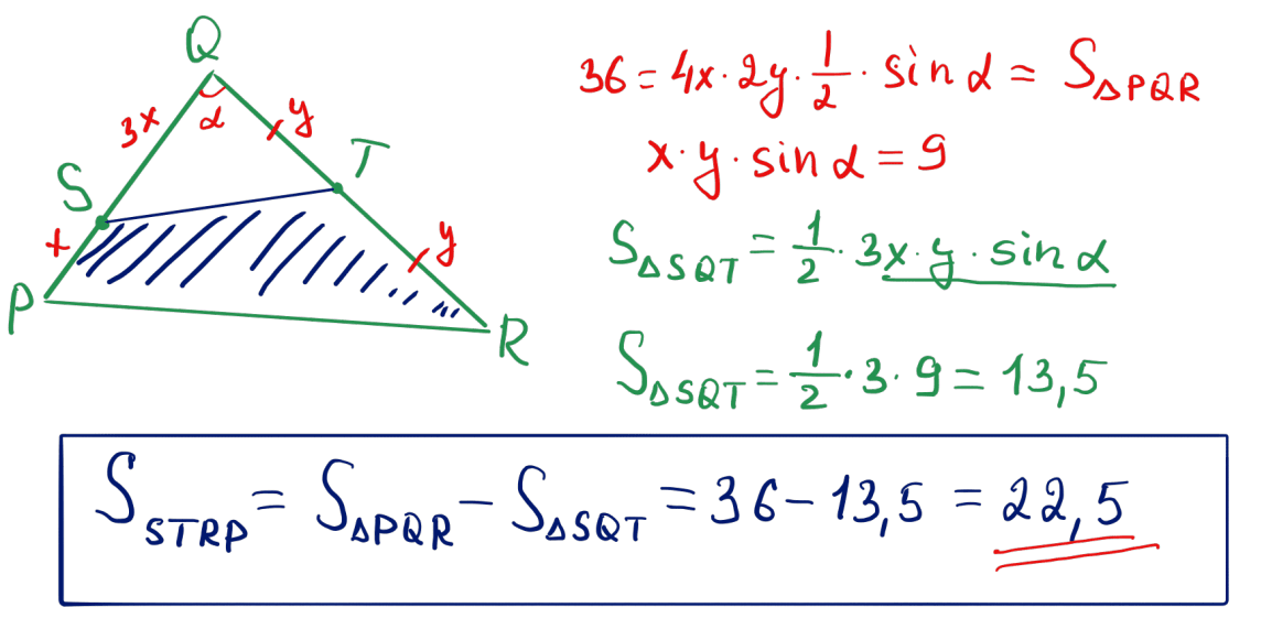 № 25 $PQR$ үшбұрышының ауданы 36-ға тең. $S$ нүктесі $PQ$ қабырғасын $1:3$ қатынасында бөледі, ал $T$ нүктесі – $QR$ қабырғасының ортасы болып табылады. $STRP$ төртбұрышының ауданын табыңыз.