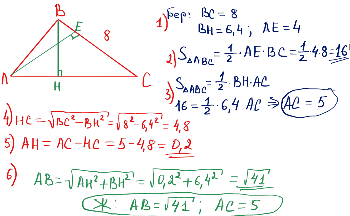 № 26 Егер $BC=8$, ал $AC$ және $BC$-ға түсірілген биіктіктердің ұзындықтары сәйкесінше 6,4 және 4 тең болса, $ABC$ үшбұрышының $AB$ және $AC$ қабырғаларының ұзындықтарын табыңыз.