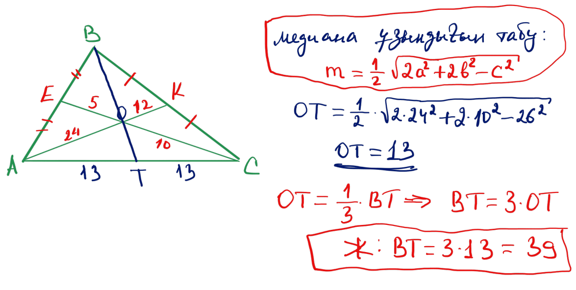 № 27 $ABC$ үшбұрышындағы $AC$ қабырғасы 26-ға тең, ал $A$ және $C$ төбелерінен жүргізілген медианалары сәйкесінше 36 және 15. Үшінші медиананы табыңыз.