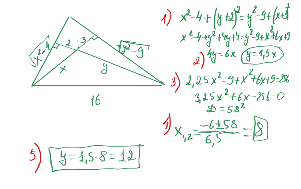 № 28 Доғал бұрышты үшбұрыштың үлкен қабырғасы 16, ал оның екі ұшынан жүргізілген биіктіктері, доғал бұрыштың төбесінен 2 және 3-ке тең қашықтықта болады. Үшбұрыштың екі кіші қабырғаларын табыңыз.