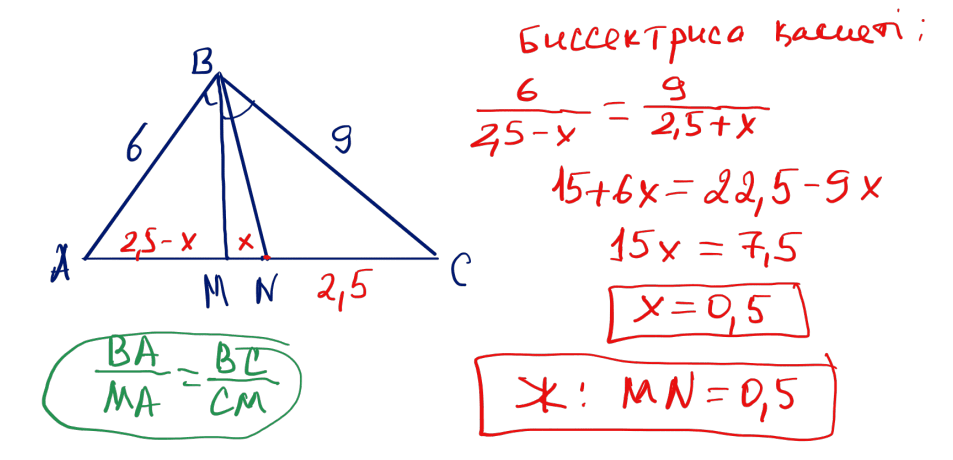№ 29 $ABC$ үшбұрышында: $AB=6$; $BC=9$; $AC=5$; $BM$ биссектрисасы және $BN$ медианасы жүргізілген ($M\in AC$, $N\in AC$). $MN$ кесіндісінің ұзындығын табыңыз.