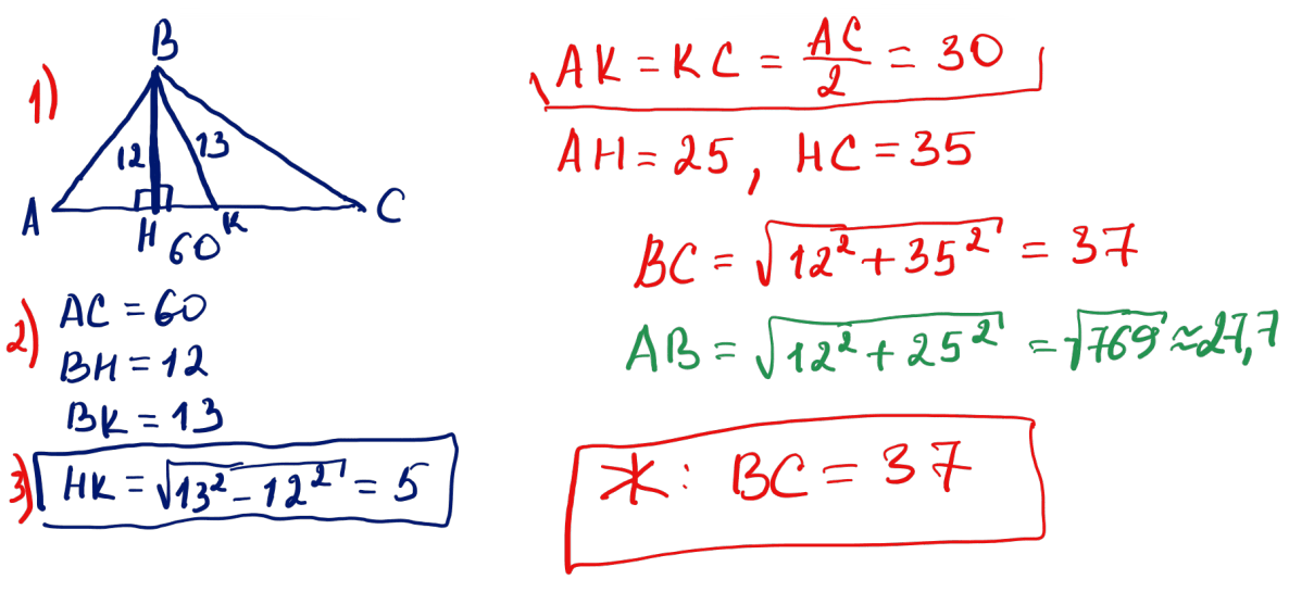 № 2 Үшбұрыштың табаны 60, биіктігі 12, ал табанына жүргізілген медианасы 13-ке тең. Үшбұрыштың үлкен бүйір қабырғасын анықтаңыз.