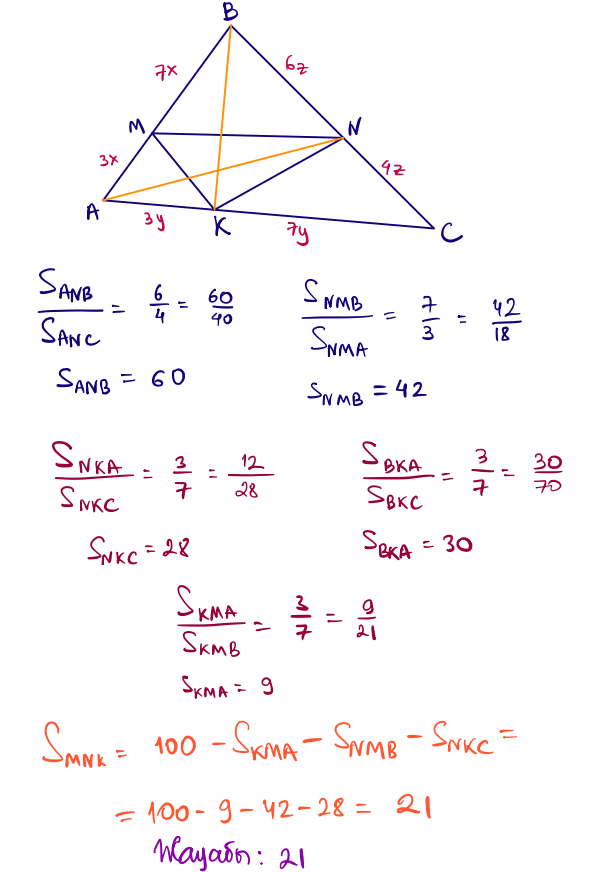 № 30 $ABC$ үшбұрышының ауданы 100-ге тең. $M$ нүктесі $AB$ қабырғасына тиісті, мұндағы $AM:AB=3:10$. $N$ нүктесі $BC$ қабырғасына тиісті, мұндағы $BN:BC=6:10$. $K$ нүктесі $CA$ қабырғасына тиісті, мұндағы $CK:CA=7:10$. $MNK$ үшбұрышының ауданын табыңыз.