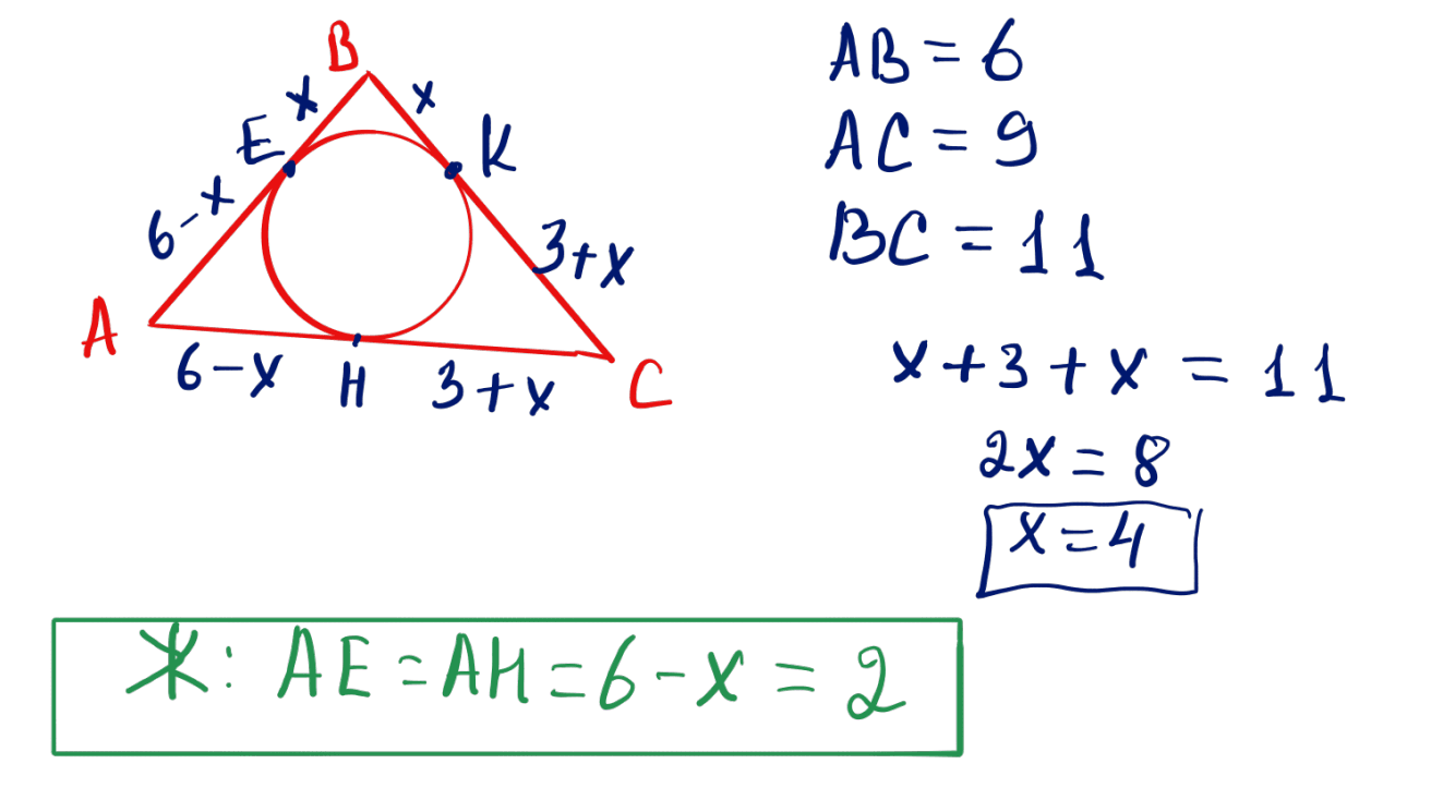 № 31 Үшбұрышқа (қабырғалары 6; 9; 11) іштей дөңгелек салынған. Үшбұрыштың қабырғалары жанасу нүктелерімен бөлінген. Барлық алты бөліктің ішінен кішісінің ұзындығын табыңыз.