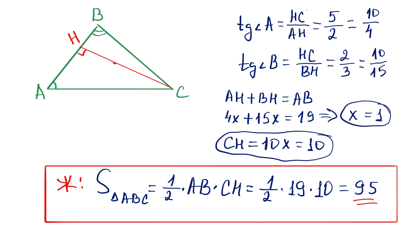 № 32 $ABC$ үшбұрышында $AB=19$, бұрыштары $\angle A=\arctan\dfrac{5}{2}$, $\angle B=\arctan\dfrac{2}{3}$. $ABC$ үшбұрышының ауданын табыңыз.