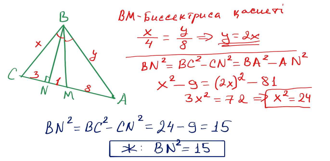 № 33 $ABC$ үшбұрышында $BM$ биссектрисасы және $BN$ биіктігі жүргізілген, мұндағы $M\in AC$ және $N\in AC$; $AM=8$; $MN=1$; $NC=3$. $BN$ биіктігінің квадратын табыңыз.