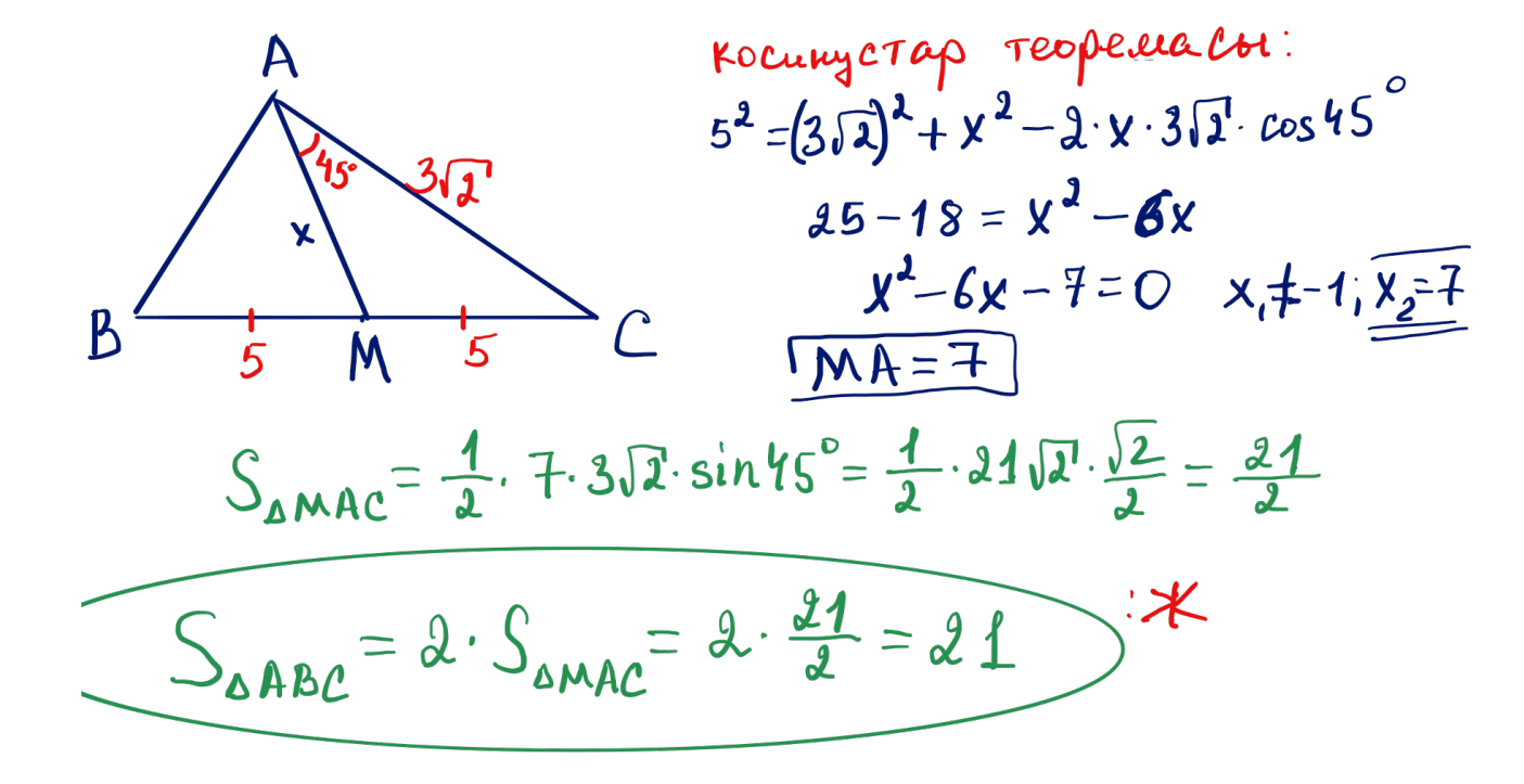 № 34 $ABC$ үшбұрышында $AM$ медианасы жүргізілген. Егер $AC=3\sqrt{2}$, $BC=10$, $\angle MAC=45^\circ$ болса, $ABC$ үшбұрышының ауданын табыңыз.