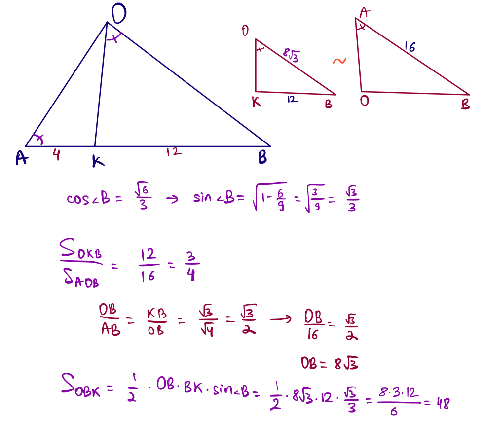 № 35 $BK=12$, $AK=4$, $\angle BOK=\angle BAO$, $\cos\angle B=\dfrac{\sqrt{6}}{3}$ болатындай $ABO$ үшбұрышының $AB$ қабырғасында $K$ нүктесі жатыр. $OBK$ үшбұрышының ауданын табыңыз.