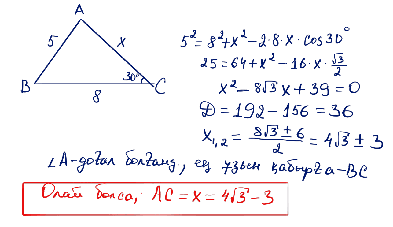№ 36 $\angle C=30^\circ$, $AB=5$, $BC=8$ болатындай $ABC$ үшбұрышында $A$ бұрышы – доғал. $AC$ қабырғасын табыңыз.