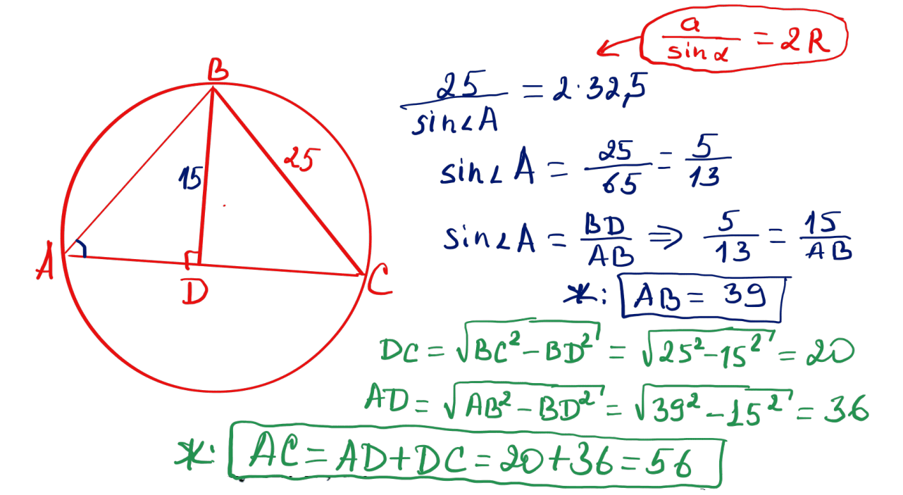 № 37 $ABC$ үшбұрышының $BC$ қабырғасы 25-ке тең, биіктігі $BD=15$, оған сырттай сызылған шеңбердің радиусы $R=32{,}5$. Үшбұрыштың қалған екі қабырғаларын анықтаңыз.
