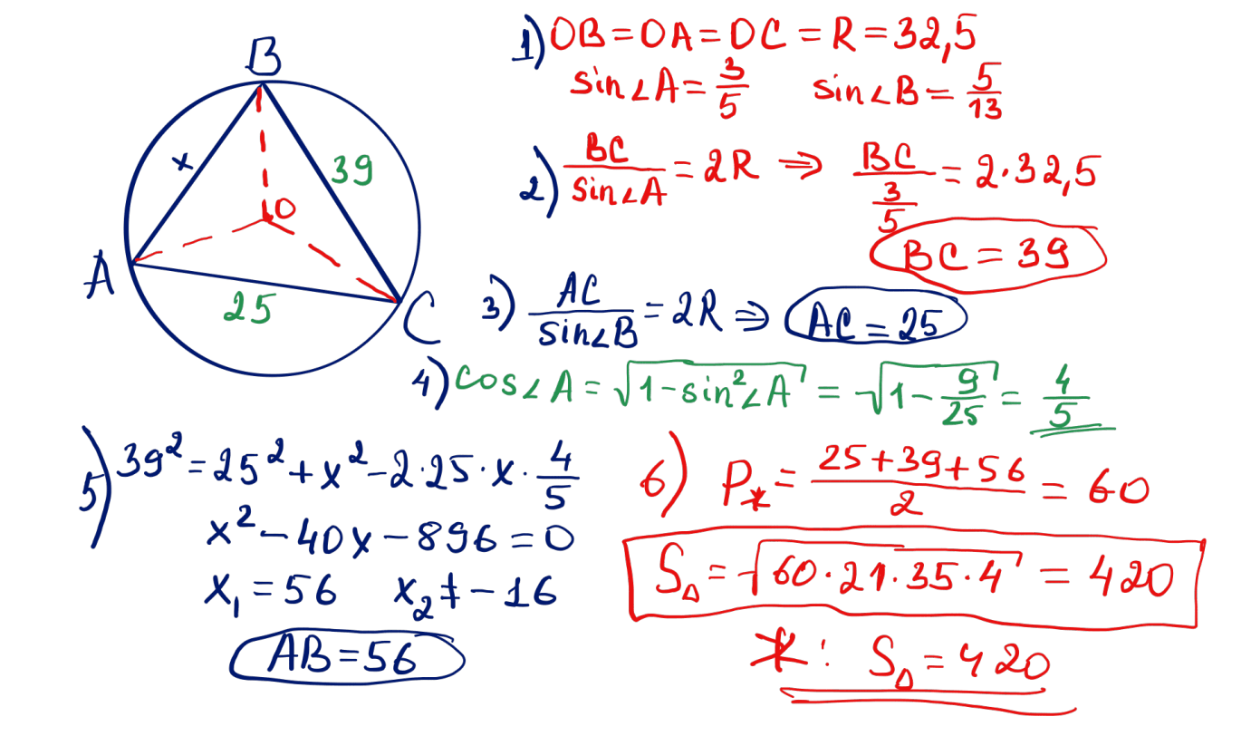 № 38 Үшбұрыштың екі сүйір бұрышының синустары $\dfrac{3}{5}$ және $\dfrac{5}{13}$-ке тең, ал оған сырттай сызылған шеңбердің радиусы 32,5. Үшбұрыштың ауданын табыңыз.