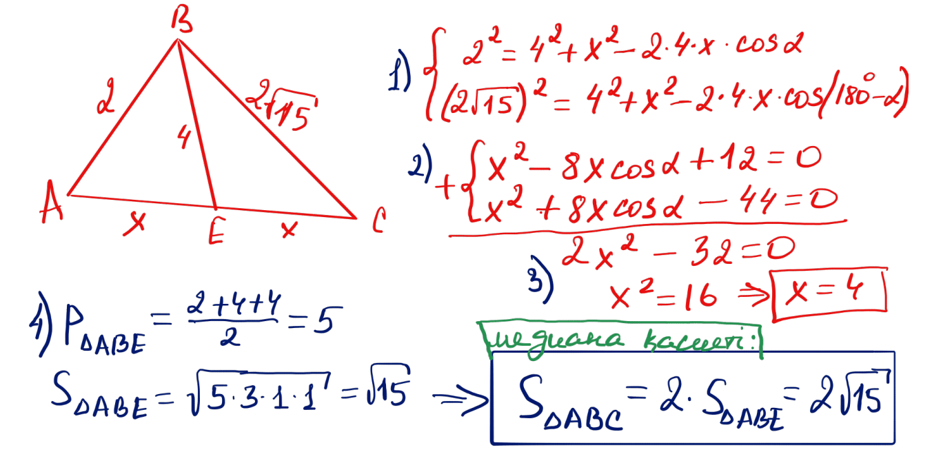 № 39 Үшбұрыштың екі қабырғасы 2 және $2\sqrt{15}$, ал үшінші қабырғасының медианасы 4. Үшбұрыштың ауданын табыңыз.