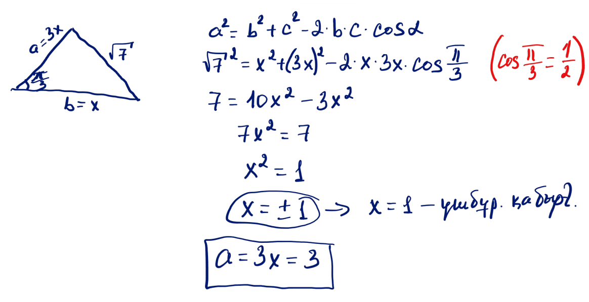 № 3 Үшбұрыштың бұрышы $\dfrac{\pi}{3}$, ал оған қарама-қарсы қабырғасы $\sqrt{7}$-ге тең. Басқа қабырғаларының ұзындықтары $a:b=3:1$ қатынасындай. Үшбұрыштың үлкен қабырғасын табыңыз.