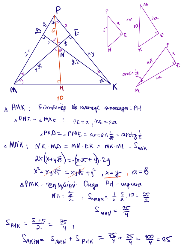 № 40 $MNK$ үшбұрышында $\angle MNK$ бұрышы – доғал. $MD$ және $KE$ биіктіктері $P$ нүктесінде қиылысады. $PN=5$; $MK=10$. $MNKP$ төртбұрышының ауданын табыңыз.
