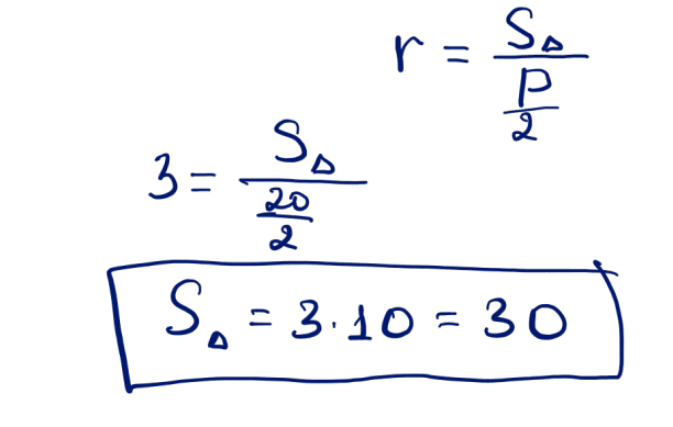 № 5 Үшбұрышқа іштей сызылған шеңбердің радиусы 3-ке тең, ал үшбұрыштың периметрі – 20. Үшбұрыштың ауданын табыңыз.