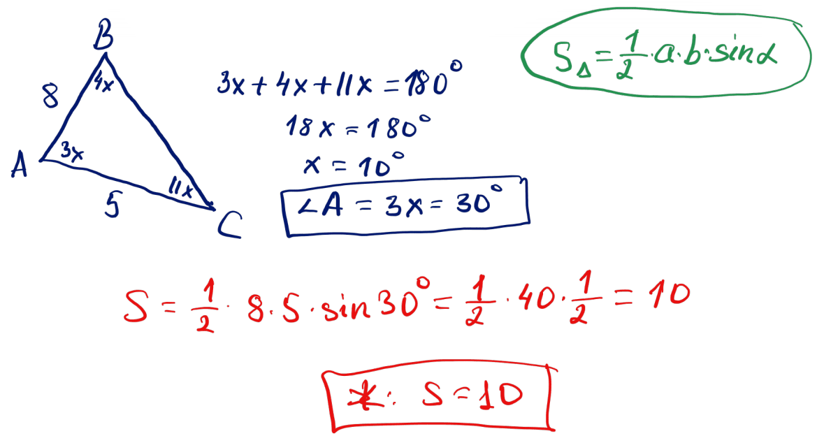 № 6 $ABC$ үшбұрышының $AB=8$; $AC=5$; $\angle A:\angle B:\angle C=3:4:11$. Үшбұрыштың ауданын табыңыз.