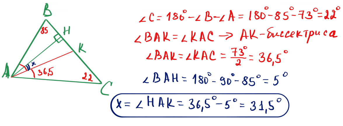 № 7 $ABC$ үшбұрышында: $\angle A=73^\circ$, $\angle B=85^\circ$. $BC$ қабырғасына түсірілген $A$ бұрышының биссектрисасы мен биіктігінің арасындағы бұрыш қаншаға тең?