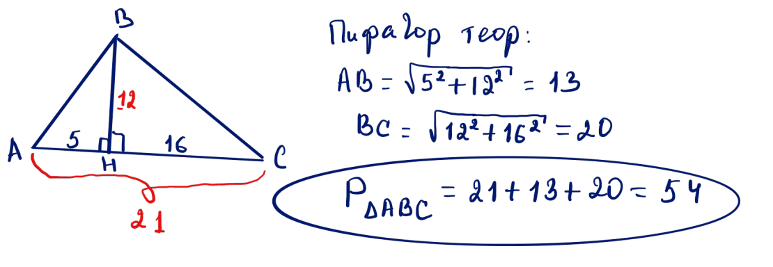 № 8 Үшбұрыштың биіктігі 12-ге тең және 21-ге тең қабырғасын $5:16$ қатынасындай бөліктерге бөледі. Үшбұрыштың периметрін табыңыз.