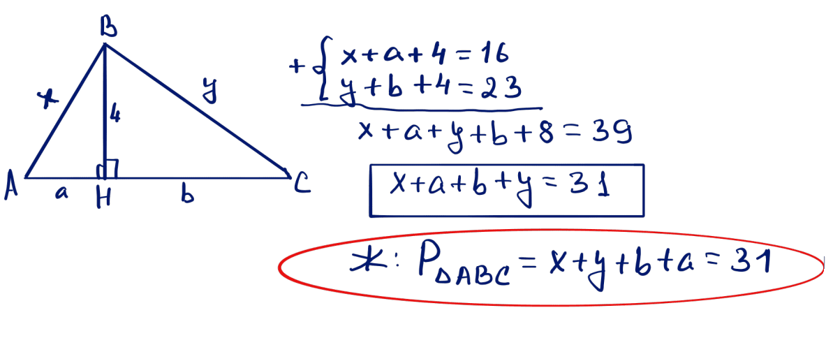 № 9 Үшбұрыштың биіктігі 4-ке тең. Ол оны сәйкесінше периметрлері 16 және 23 болатындай екі үшбұрышқа бөледі. Осы үшбұрыштың периметрін табыңыз.